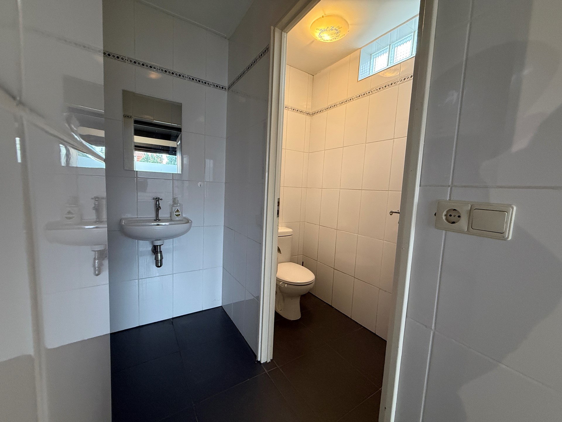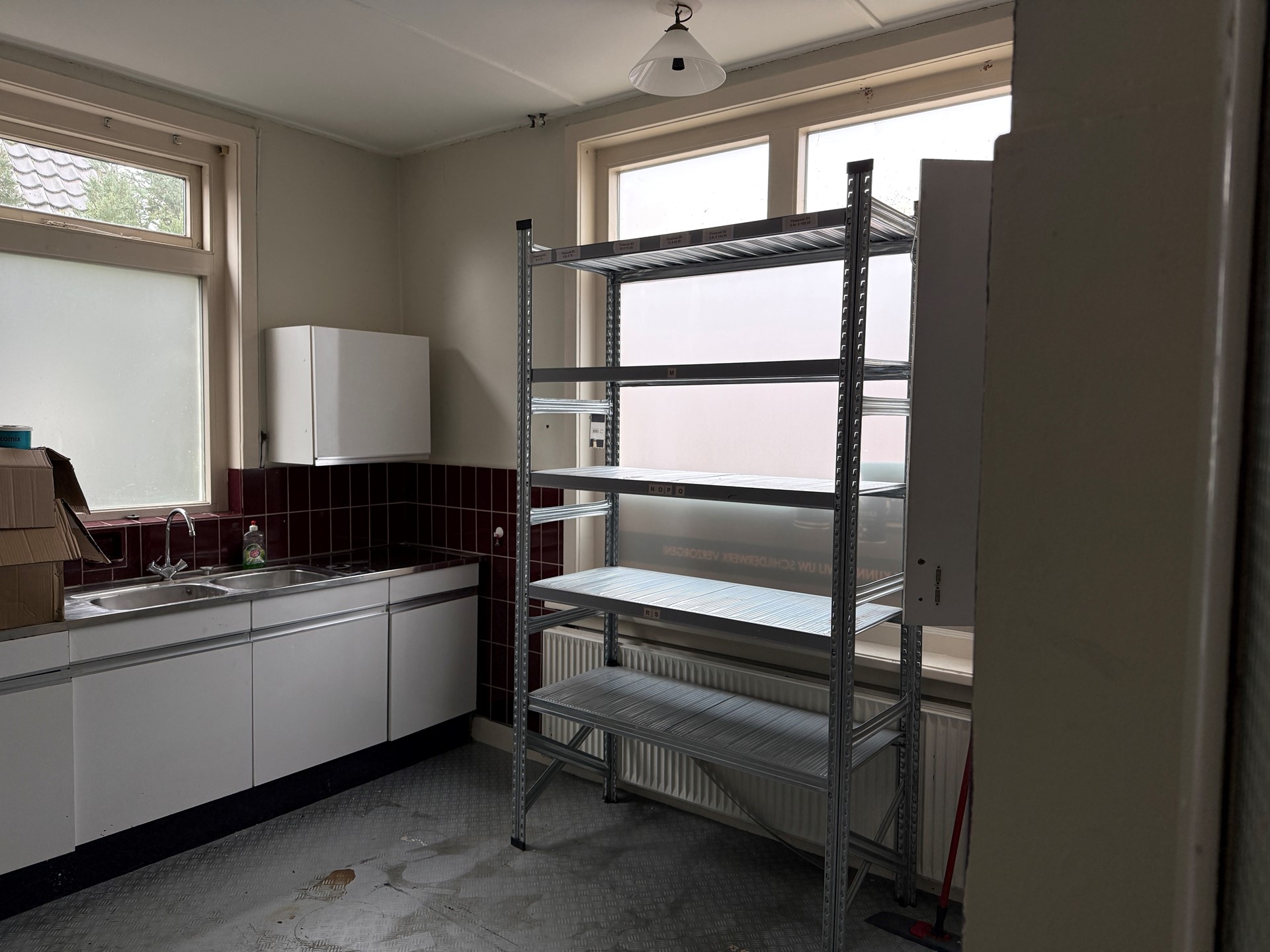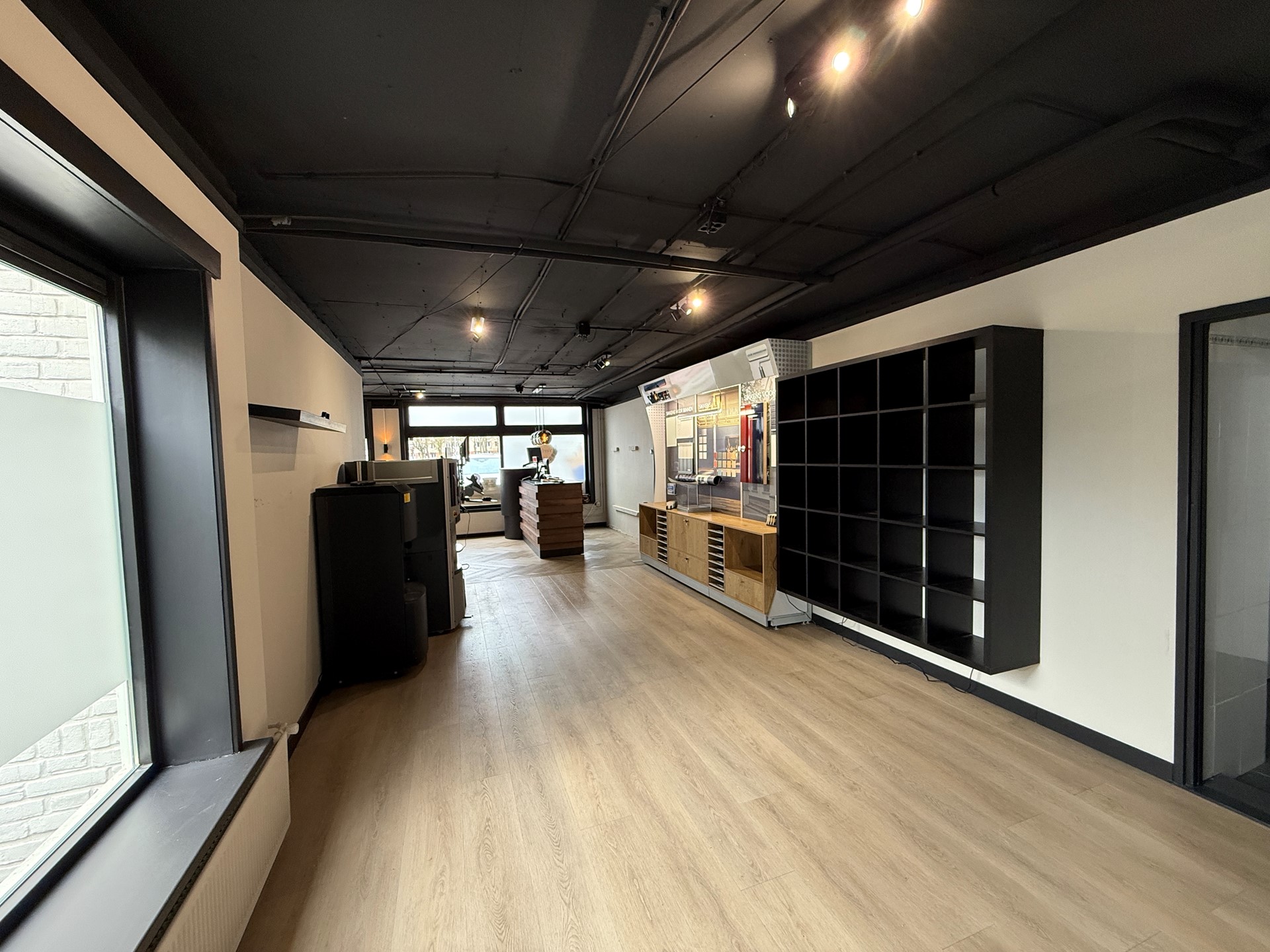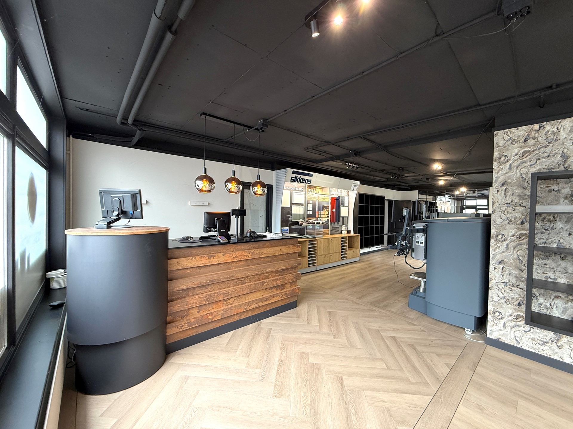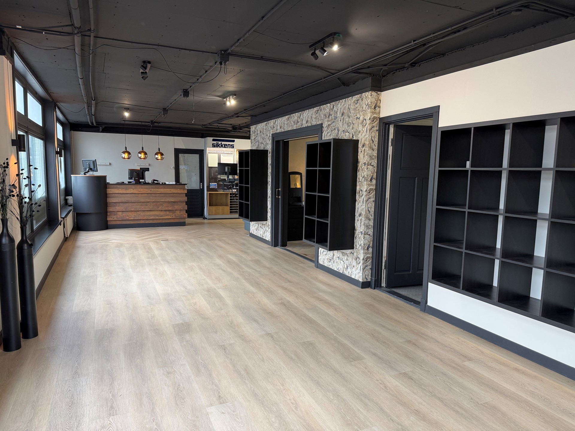 Verkoopruimte/showroom met fraaie pvc-vloer, kantoor??, verblijfsruimte met pantry, berging??, kelder en toiletruimte.
