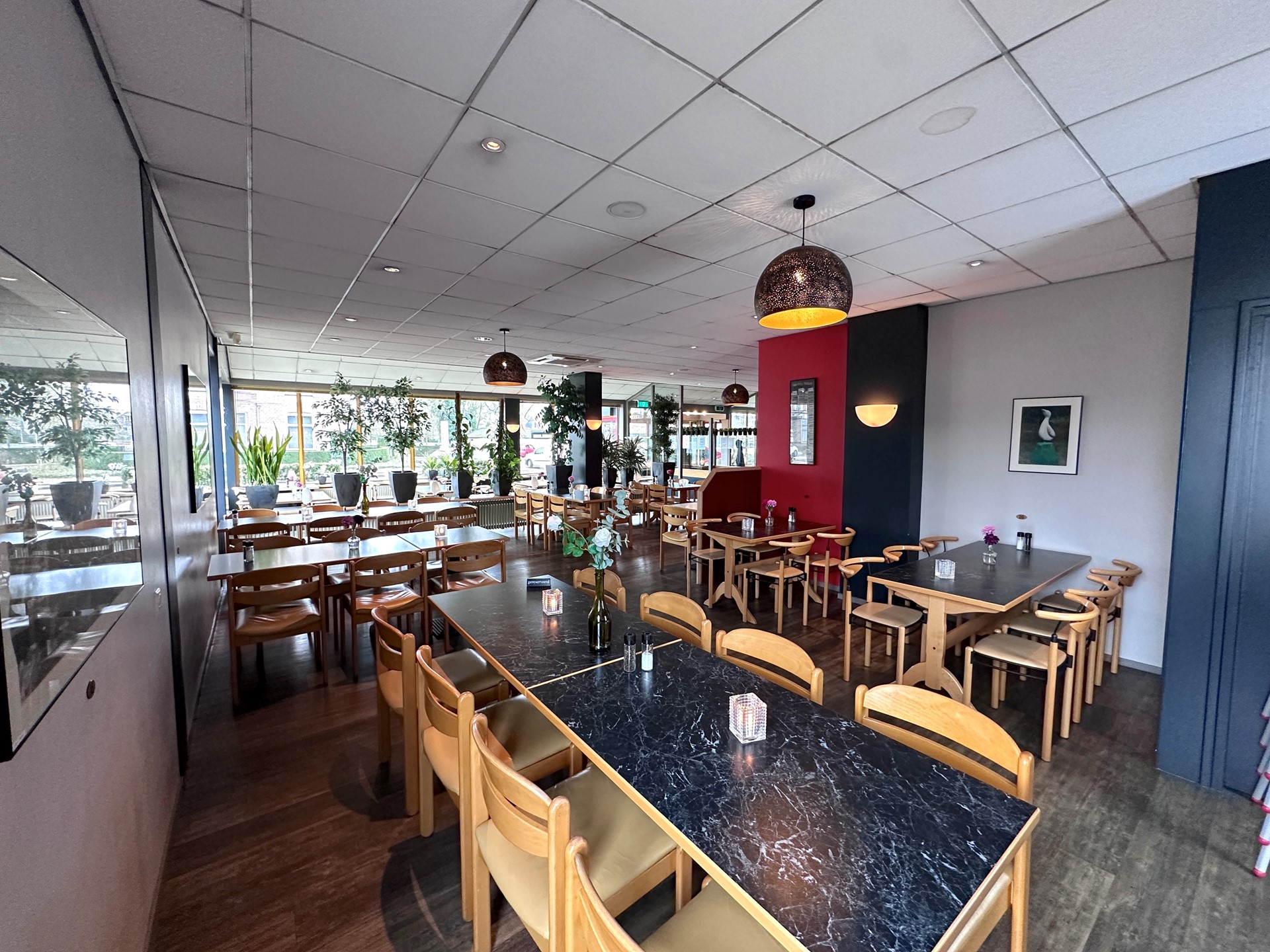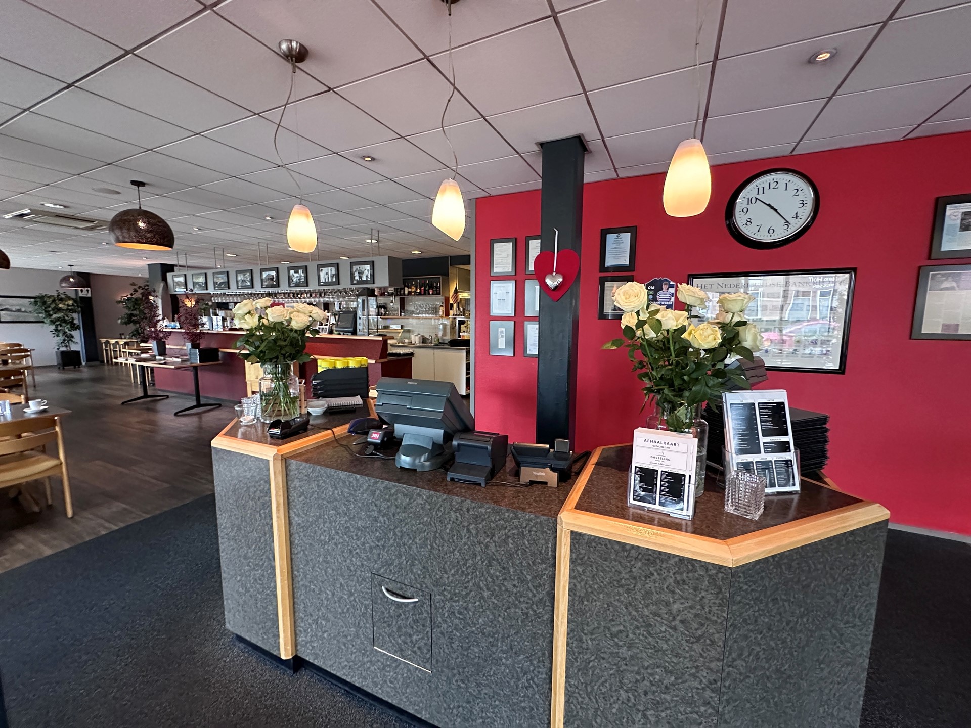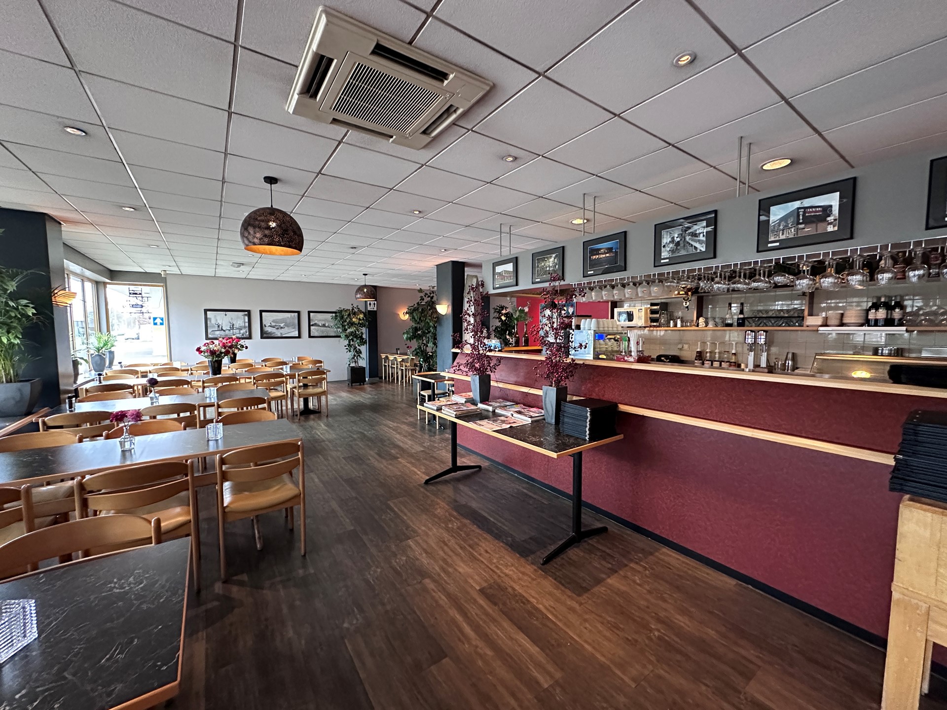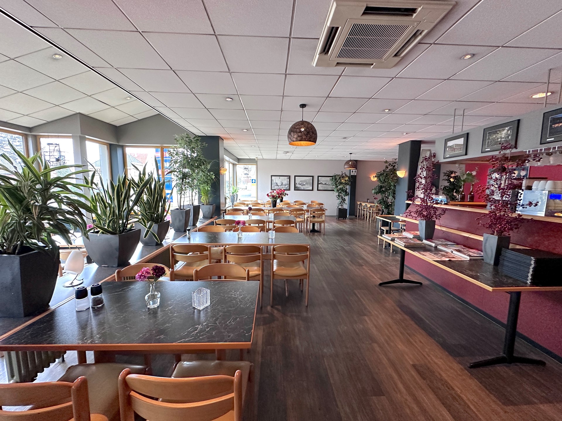 De restaurantruimte voor de gasten is volledig ingericht, met aan de linkerzijde een afhaalbalie, een buffetruimte en een bar.