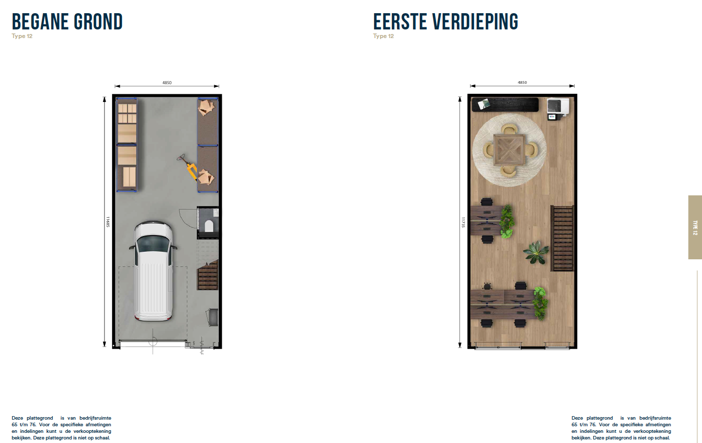De bedrijfsruimte type 12 is voorzien van een overheaddeur en een glazen loopdeur. Daarnaast is de ruimte luxueus afgewerkt met grote raampartijen wat zorgt voor veel lichtinval. De uitstraling is luxe door de hoge ruimtes op zowel de begane grond als op de verdieping. De royale opzet van de gebouwen zorgt voor een ruimtelijke uitstraling.