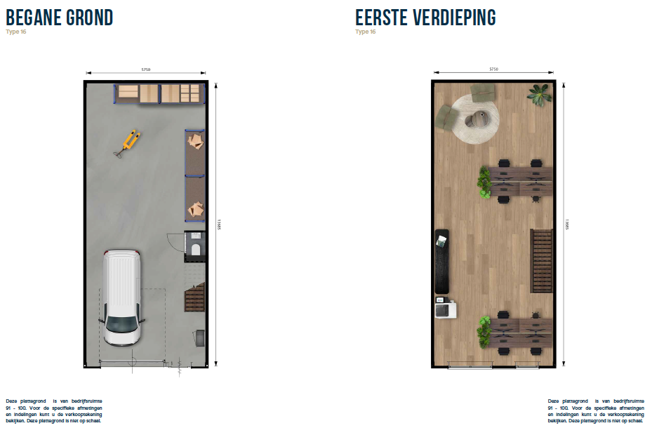 De bedrijfsruimte type 16 is voorzien van een overheaddeur en een glazen loopdeur. Daarnaast is de ruimte luxueus afgewerkt met grote raampartijen. De uitstraling is luxe door de hoge ruimtes op zowel de begane grond als op de verdieping. Deze ruimtes hebben een goede zichtbaarheid en zijn praktisch in te delen. De royale opzet van de gebouwen zorgt voor een ruimtelijke uitstraling.