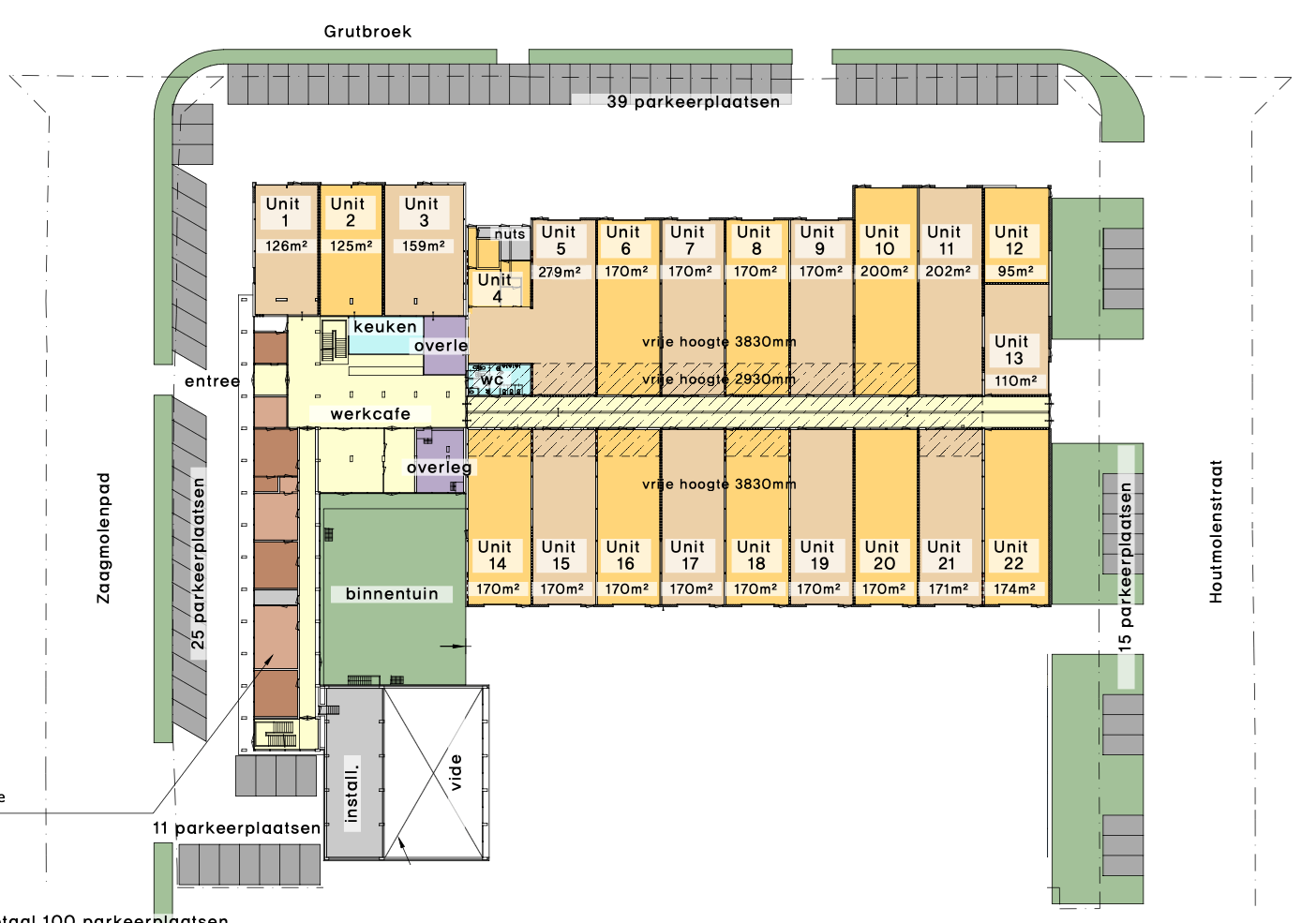 De bedrijfsruimte is voorzien van 1 eigen parkeerplaats en het direct omliggende buitenterrein is mandelig terrein en rondom komen ook parkeervakken.